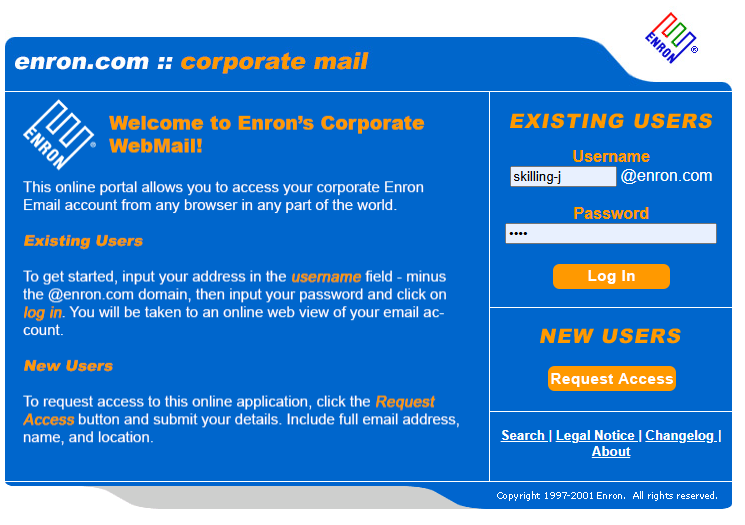 Enron WebMail enables users to browse, search, and access the publicly released Enron Email dataset, as disseminated by the Federal Energy Regulatory Commission (FERC) during the investigations into Enron Corp. The application has been developed entirely anew, providing access to the emails, calendar events, and attachments contained within the dataset. The website replicates the aesthetic of Enron’s 2001 internet presence, utilizing the corresponding style for graphics, layout, and color schemes.